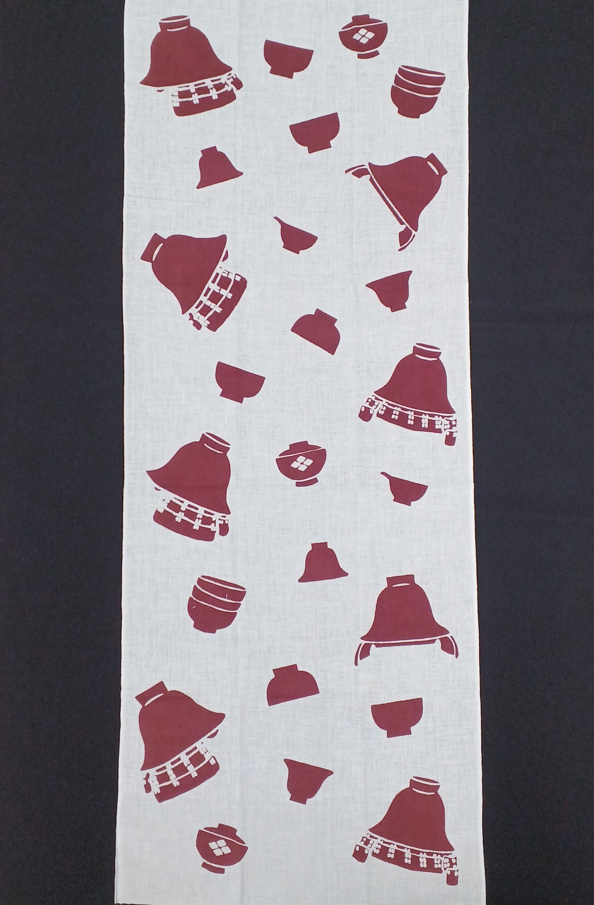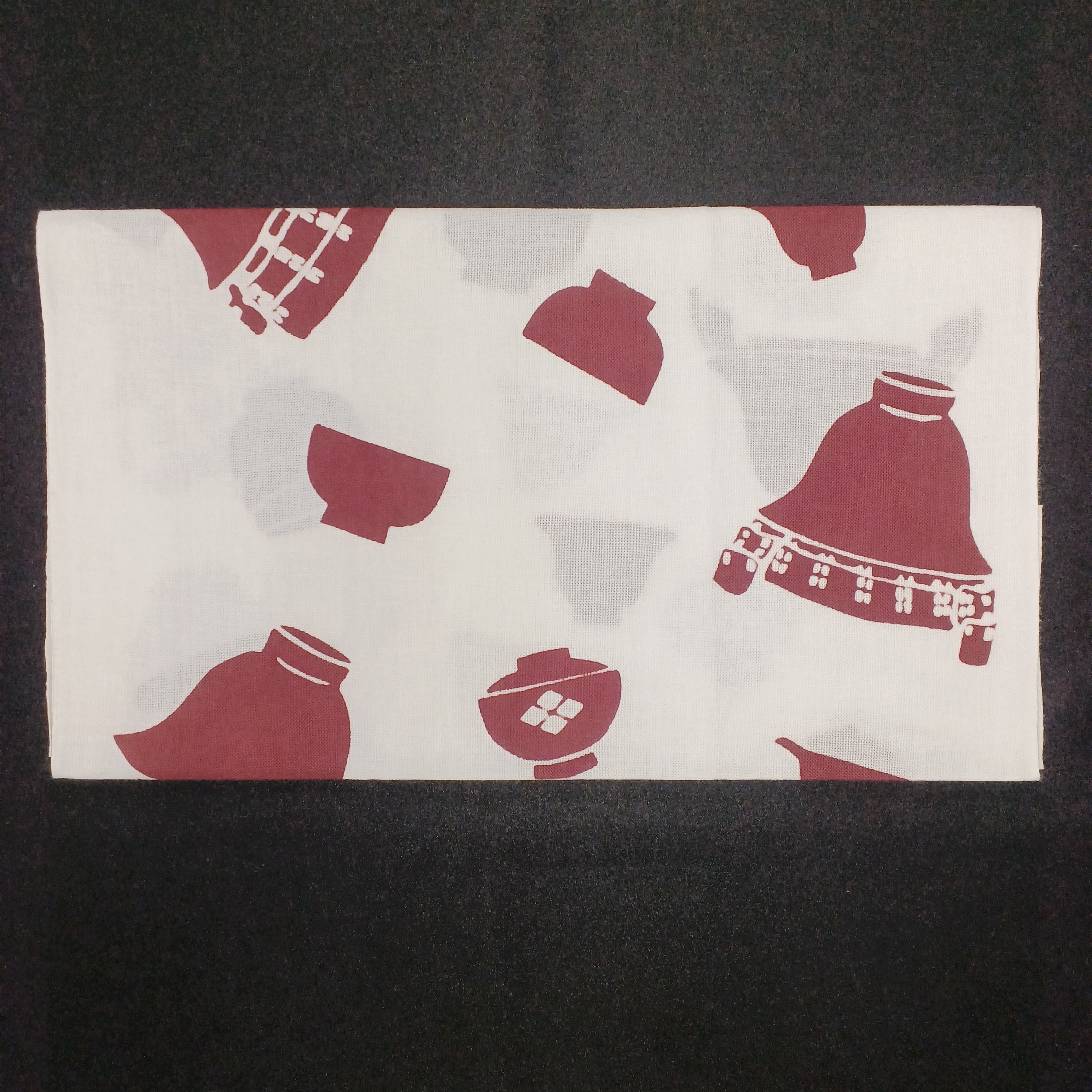 長い名前の中の、「合子」というのは蓋つきのお椀という意味。ケシゴムハンコでいろいろなお椀を再現し、布に染めてみました。リズミカルで動きのあるポップな手ぬぐいに仕上がりました。